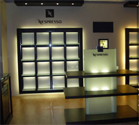 Design Studio Kompa designs Wenge-stained mahogany furniture and backlit shelves for Nespresso...